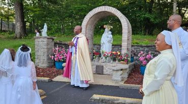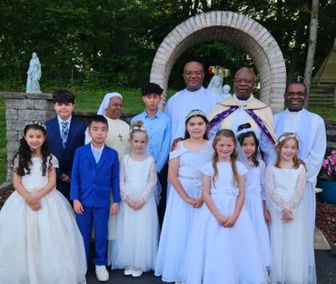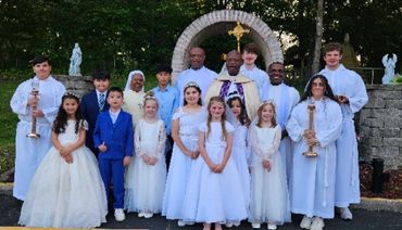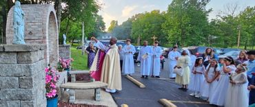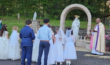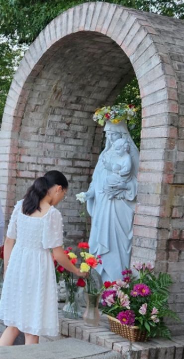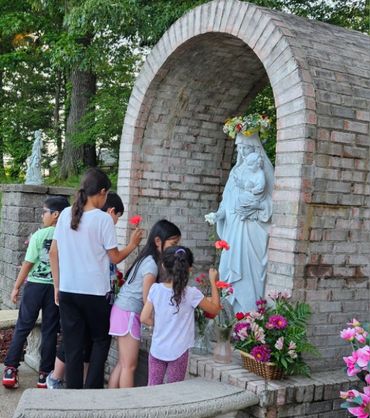 May is a month dedicated to Mary, the mother of God. Catholics traditionally have May Crownings where crowns of roses adorn a statue of Mary. Holy Cross has for many years followed this tradition. The boys and girls who have recently received their 1st Holy Communion wear their 1st Communion clothing and, after praying the Rosary in the church, lead a procession to the grotto. One child is chosen to crown The Blessed Virgin Mary, who is Queen of Heaven and Earth. The other 1st Communicants take turns presenting their roses to Mary, with other children following with flowers. Marian hymns are sung and prayers are prayed. It has also been the tradition at Holy Cross that this be a celebration that ends the year of religious education classes for our children. So after the May Crowning, all of the children, parents, teachers and some parishioners enjoy a cookout together under the pavilion.